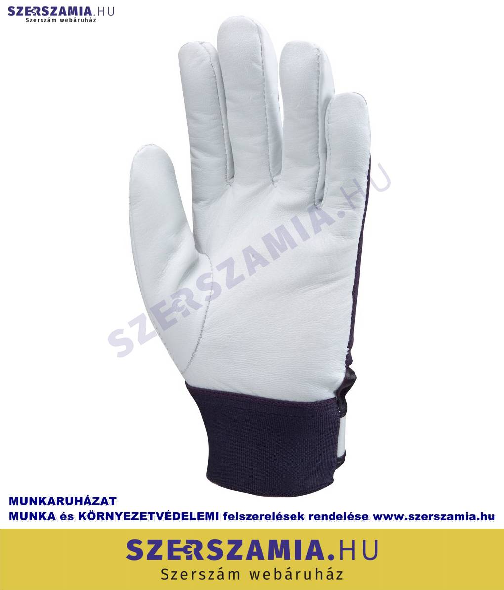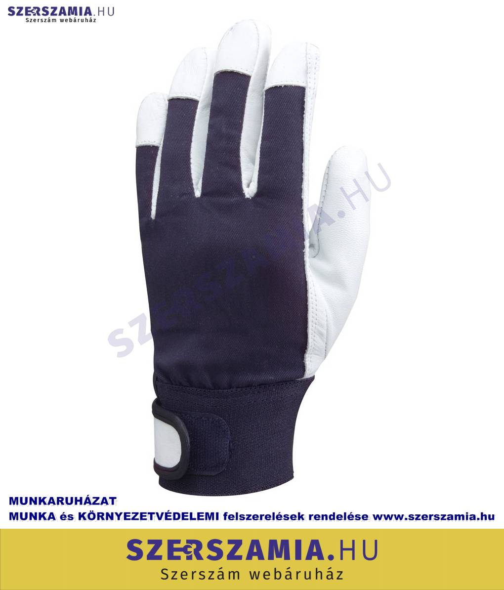 Erezett színkecskebőr sofőrkesztyű. Artéria- és körömvédő. Sötétkék vászon kézhát. Elasztikus mandzsetta, állítható tépőzáras szegéllyel. MÉRET: 10-es EU SZABVÁNY: EN420, EN388: 2112