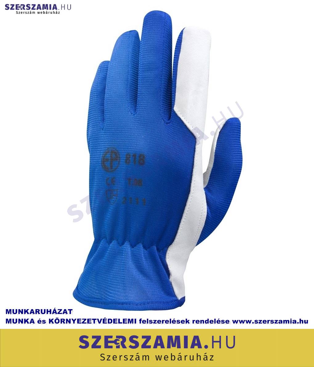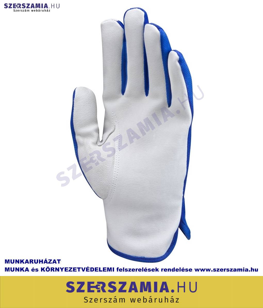 Puha színsertésbőr tenyér és mutatóujj. Erős, kék nylon kézhát. Felső csuklógumírozás. MÉRET: 9-es EU SZABVÁNY: EN420, EN388: 2021