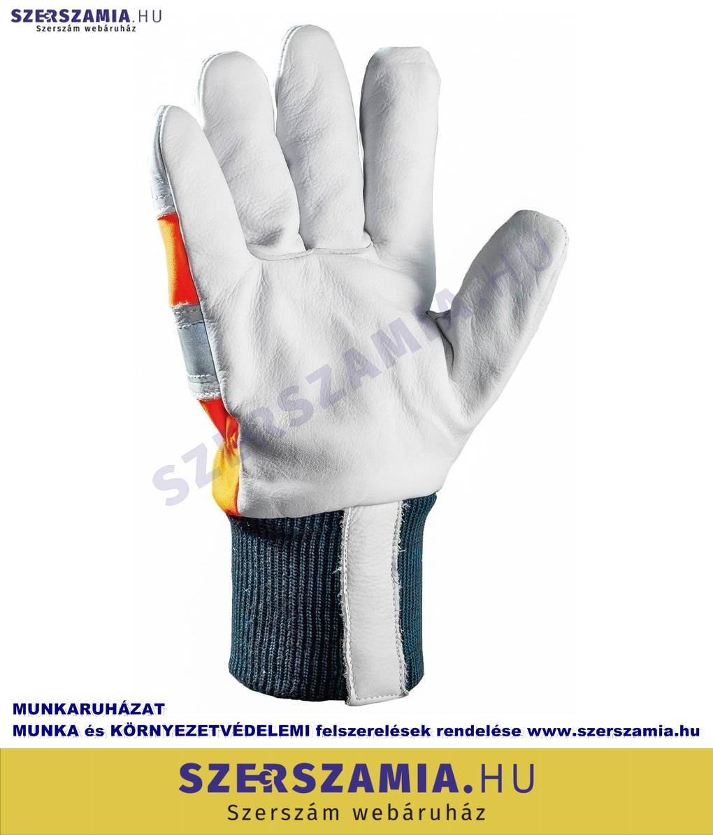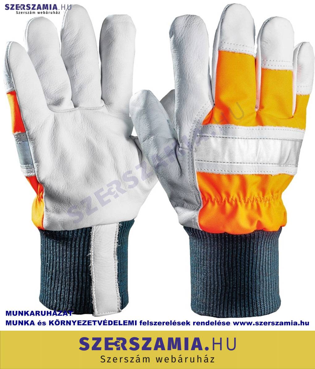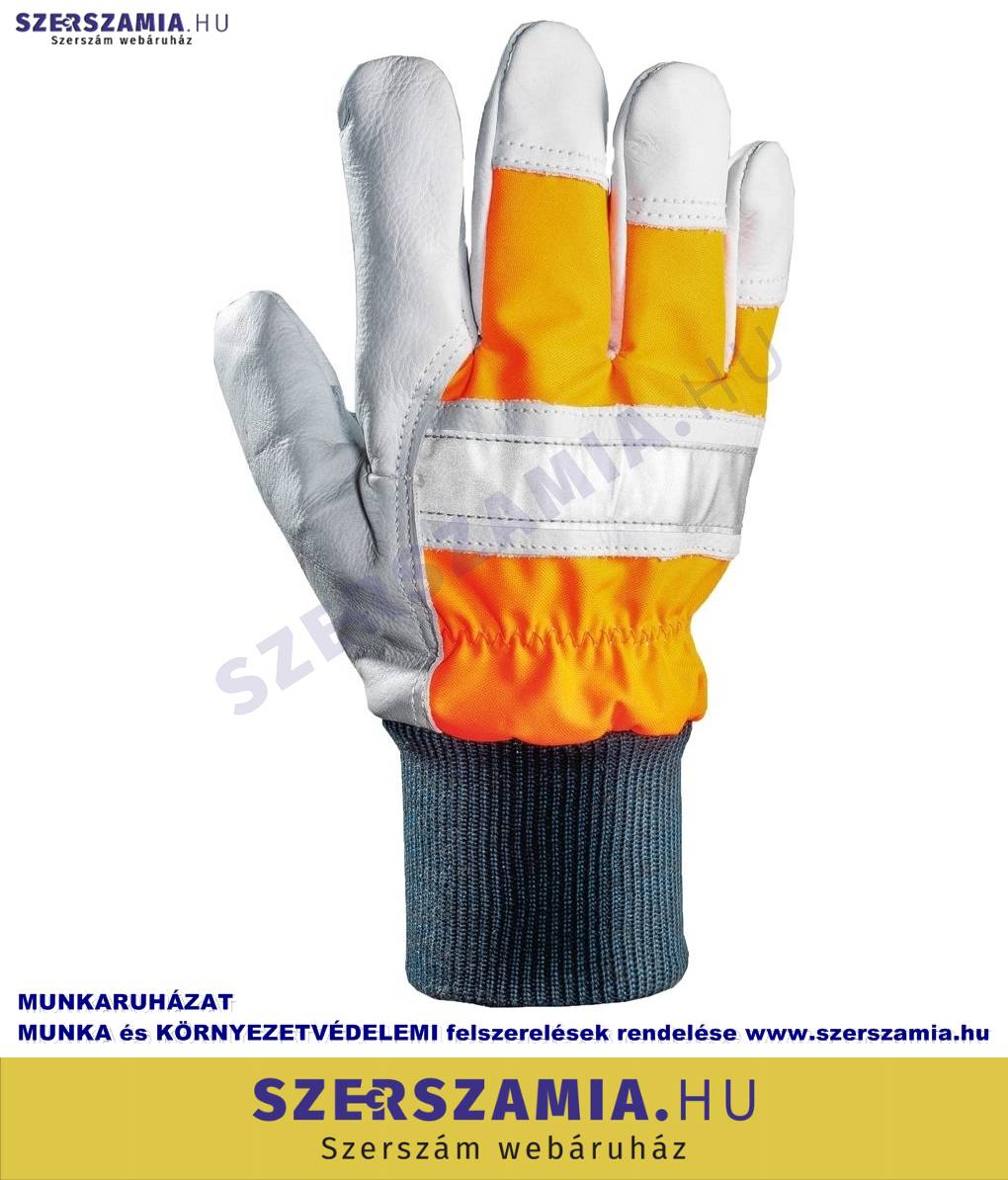 Szürke színmarhabőr tenyér, mutató- és hüvelykujj. Artéria-, köröm- és ökölcsontvédő. Vízlepergető, jól látható fluo narancs kézhát, fényvisszaverő csíkkal. Belső filc bélés hideg klíma és kontakt hideg hatása ellen. Gumírozott mandzsetta. MÉRET: 10-esEU SZABVÁNY:EN420, EN388: 2222, EN511: 12X