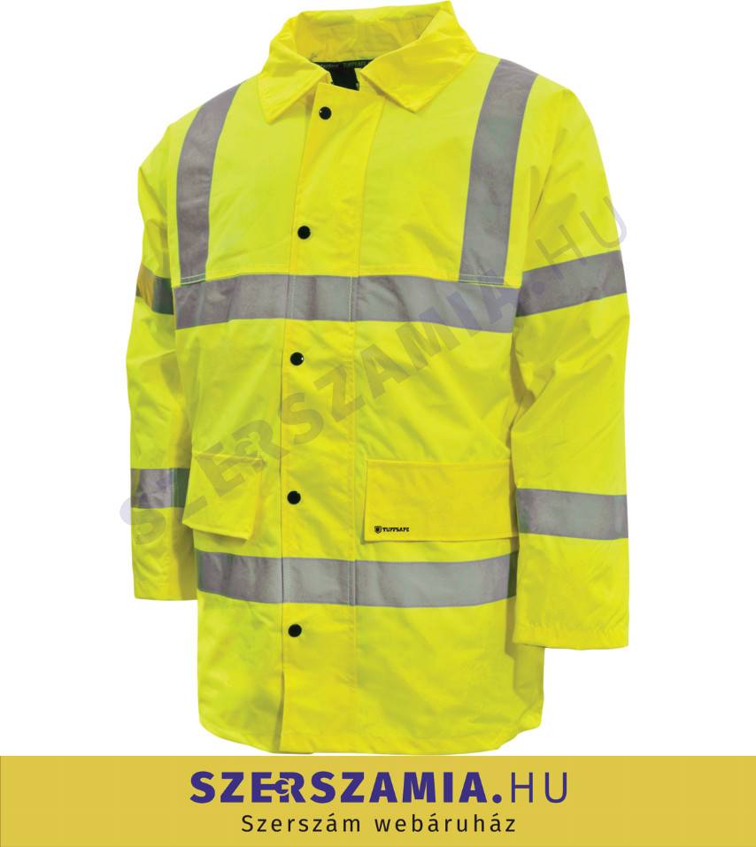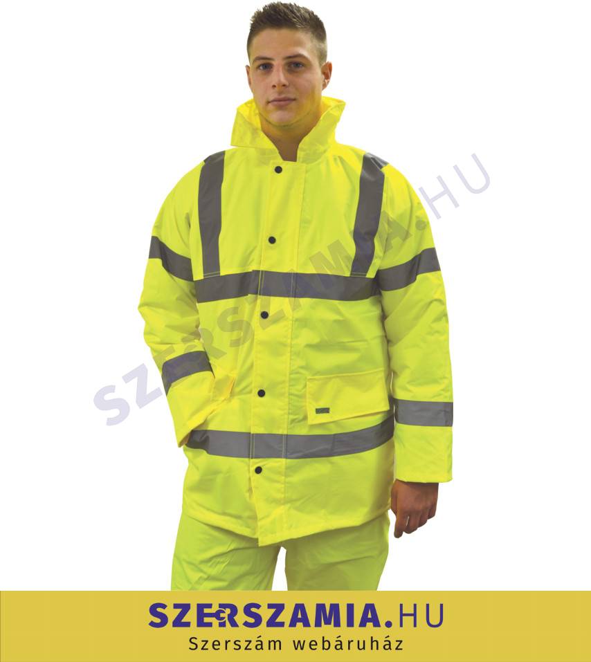 Selyemfényű sárga PU bevonatú poliészter steppelt nejlon béléssel. Két külső zseb zsebtakaróval. Erős, kétutas cipzár, patentzáras hajtókával, kötött mandzsetta, gallérba rejtett, zsinóros kapucni. Teljesen fedett vízhatlan varrások. Az ujjakon 2 x 50 mm-es fényvisszaverő csík. A fényvisszaverő szalag 3M Scotchlite.