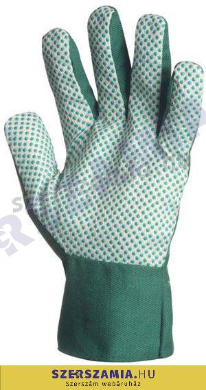 Vászon kertészkesztyű. Tenyéren csúszás elleni PVC pötytyözés. Gumírozás a kézfejen. Zöld vászon, 10-es méret EU SZABVÁNY: EN420, EN388: XX2X