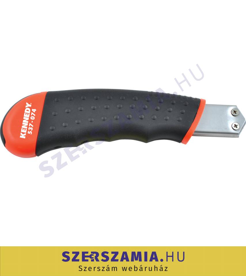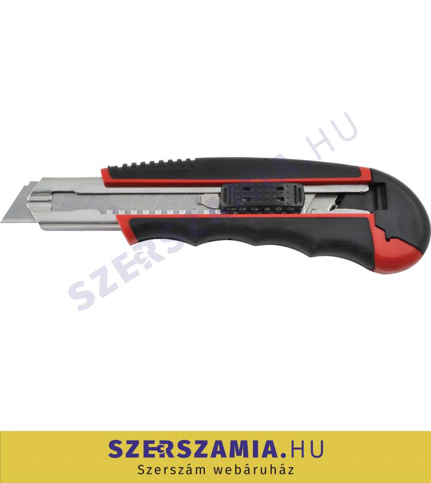 ABS műanyag ház gumi bevonattal a jobb fogás érdekében, acél pengesín, mely megakadályozza a penge megcsúszását vagy a ház elhasadását. Törhető késpenge. Egyedi rugóterhelésű automatikus pengecsere.