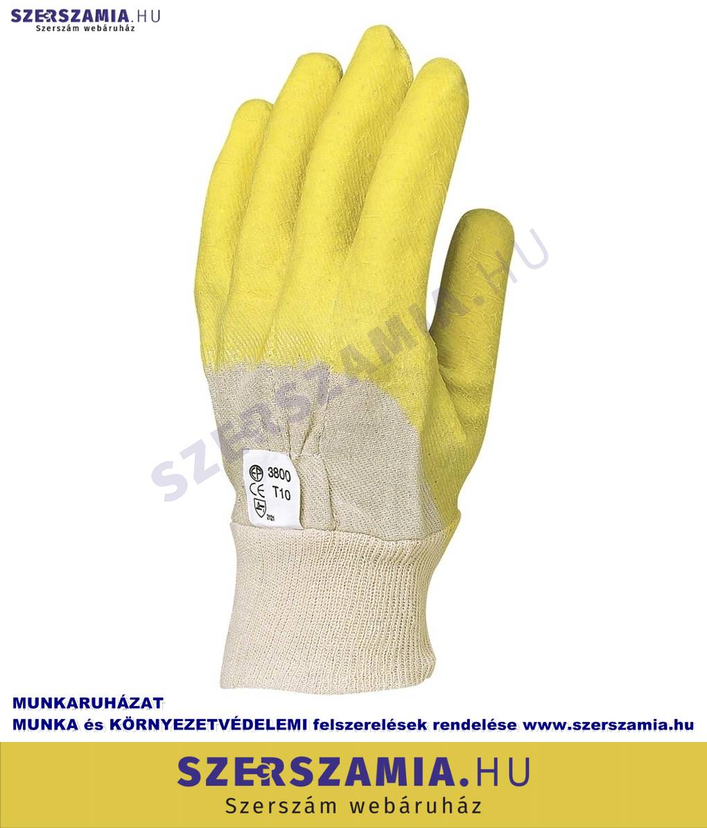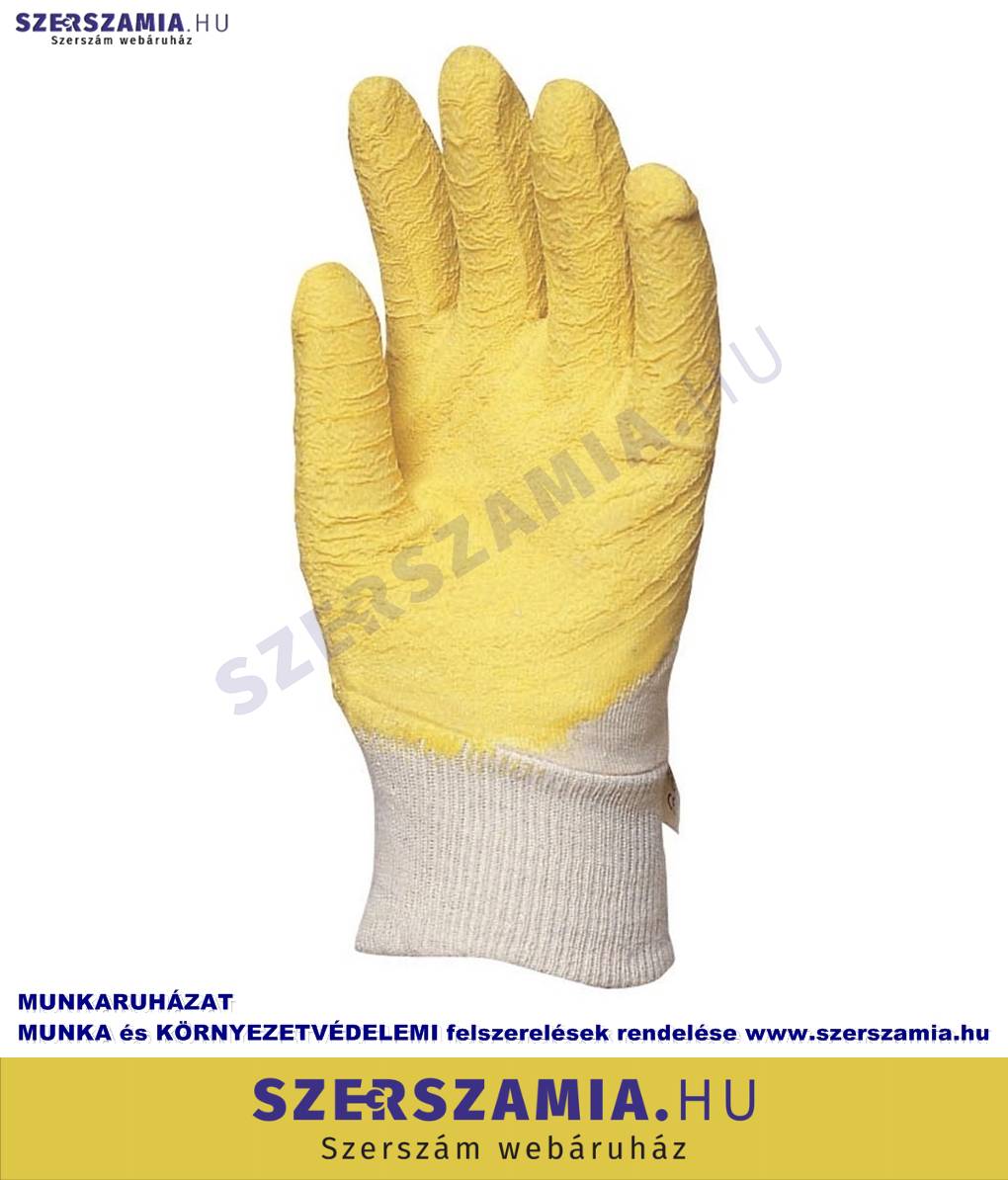 Szövött pamut alapkesztyűre ökölcsontig mártott sárga latex. Gumírozott mandzsetta, szellőző kézhát. Csúszásmentes érdesítés EU SZABVÁNY: EN420, EN388: 2121