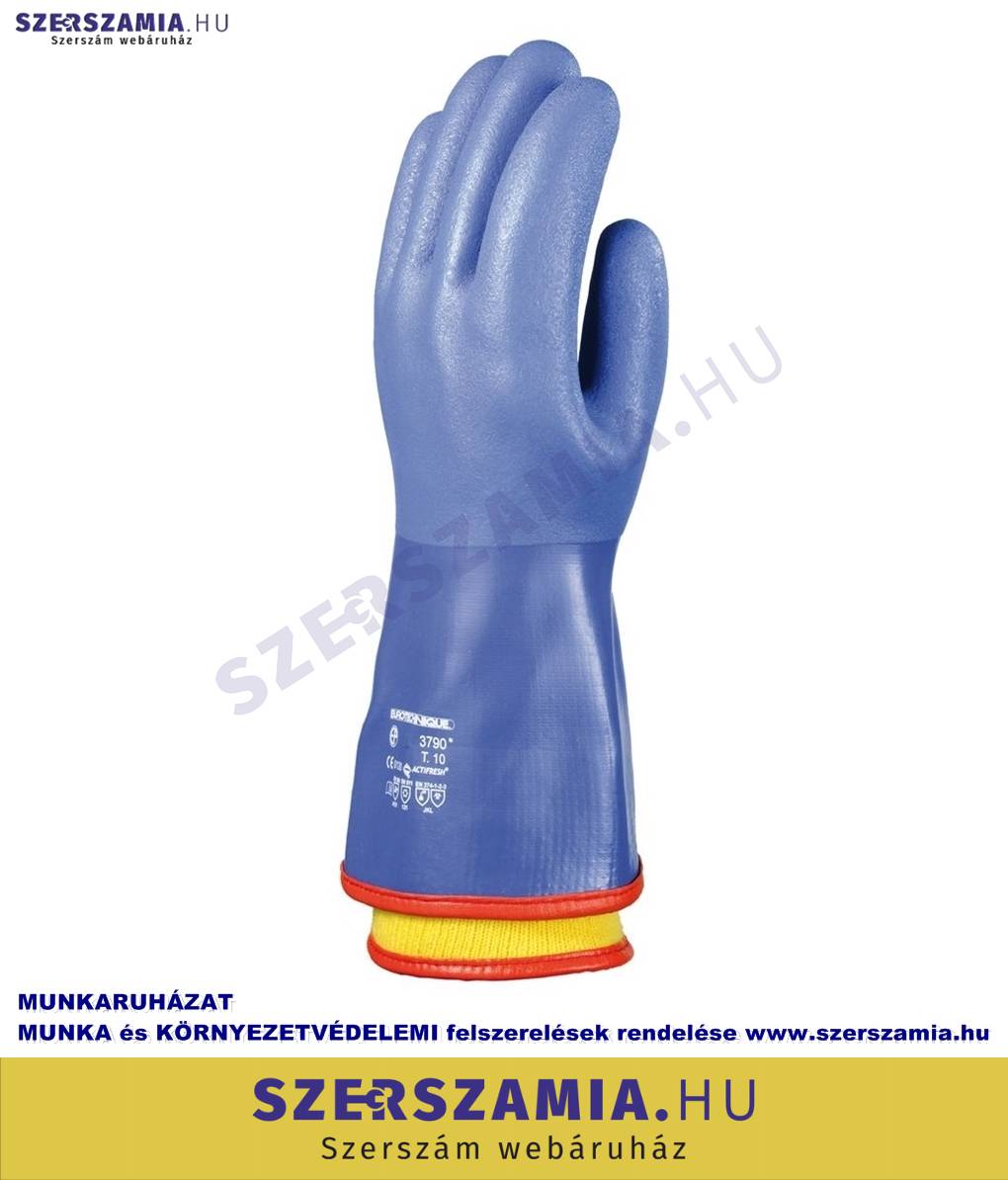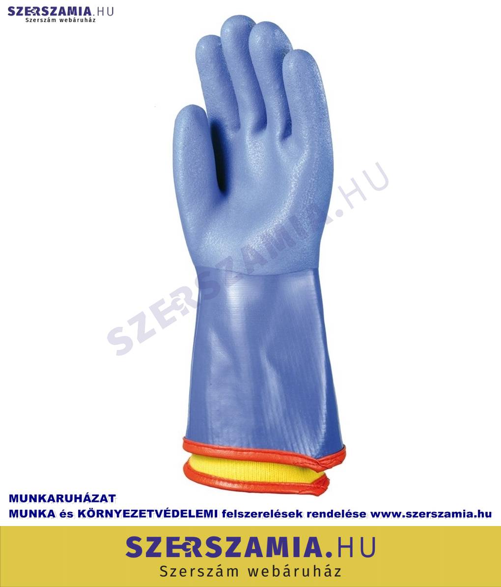 Pamutra mártott kék PVC, csúszásbiztos, érdesített felsőrésszel. Hideg klíma hatása elleni finom, bolyhos belső bélés, Actifresh® kiképzés. Sav-, lúg-, olaj- és mikroorganizmusok elleni védelem. 1,2 mm vastag, 35 cm hosszú, erős védőkesztyű. MÉRET: 8, 9 és 10-es EU SZABVÁNY: EN420, EN388: 4131, EN374-1, 374-2, 374-3: JKL, EN511: 121