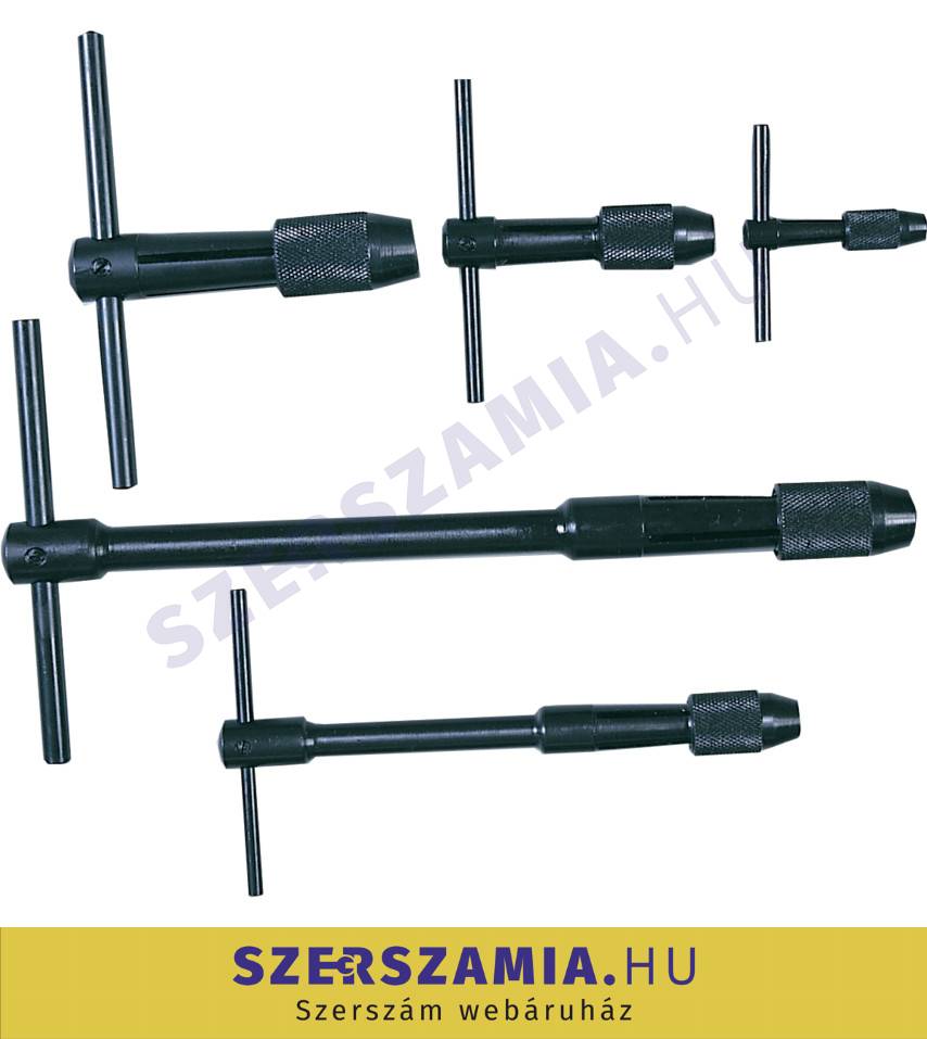 Kézi menetmegmunkáláshoz. Alkalmas nehezen hozzáférhető helyek elérésére is. Szívós acél szerszámtest recézett tokmánnyal. 4 szorító pofa a menetfúró központos szorítására és csúszórudas markolat.