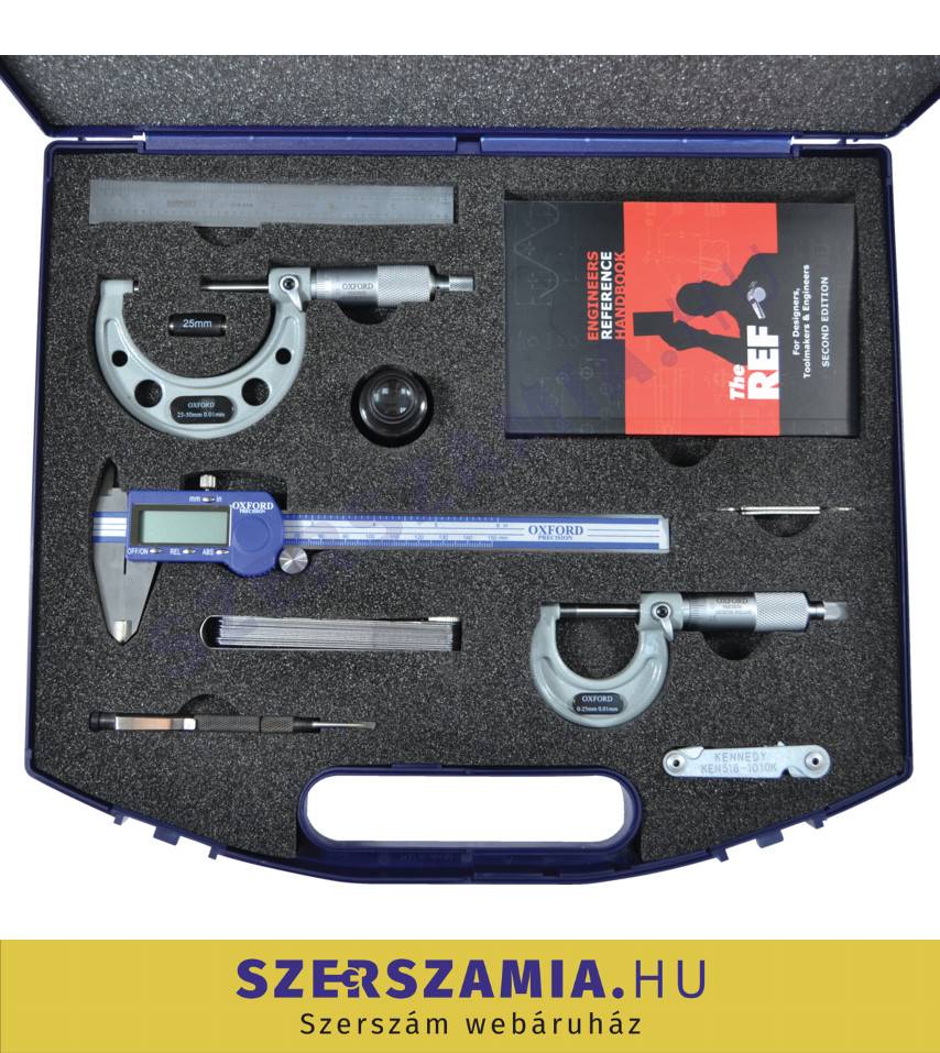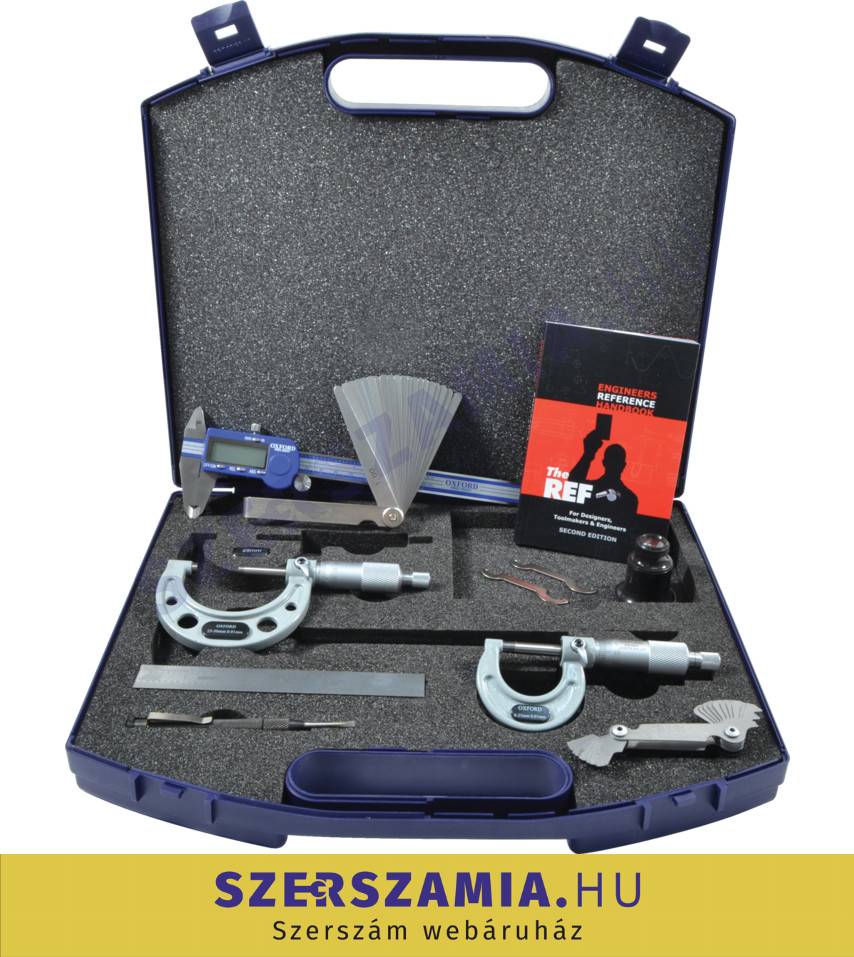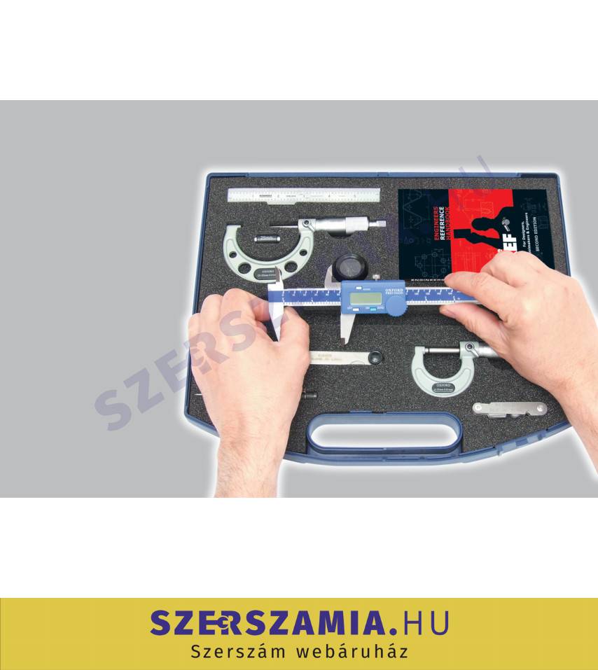 Tartalma: 150mm (6") műhelyvonalzó, 0 - 25 és 25 - 50mm-es mikrométerek, 25mm-es beállító etalon, 10x nagyítású lupé, 150 mm (6") digitális tolómérő, 0.5 - 1.0mm 20 pengés hézagmérő, 51 db-os metrikus 60°-os menetfésű.