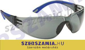 Keret és Szár: polikarbonát (F), rugalmas és hajlékony PVC szárvégekkel. Lencse: páramentes, 2, 2 mm vastag, erősített polikarbonát. 43 x 70 mm-es lencsemérettel kiváló felfekvés és széles látótér. Csekély súly (25 g). Puha, csúszásbiztos orrhíd. Oldalvédő: ívelt. Füstszínű Keret, kék bikolor szárvég, páramentes füstszínű lencse (5-2, 5 1FN, fényszűrő osztály: 3) EU SZABVÁNY: EN166, EN170, EN172, EN1836