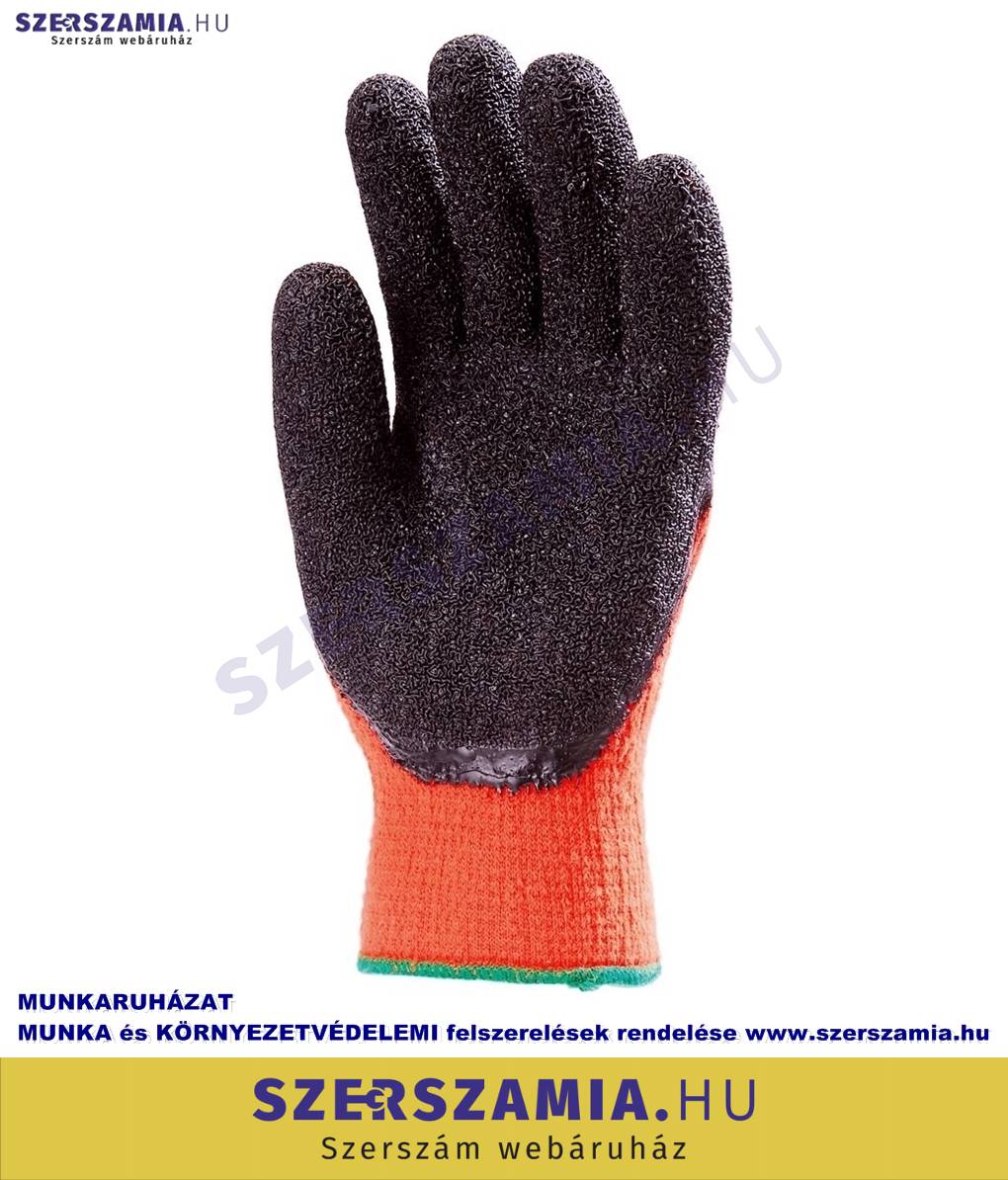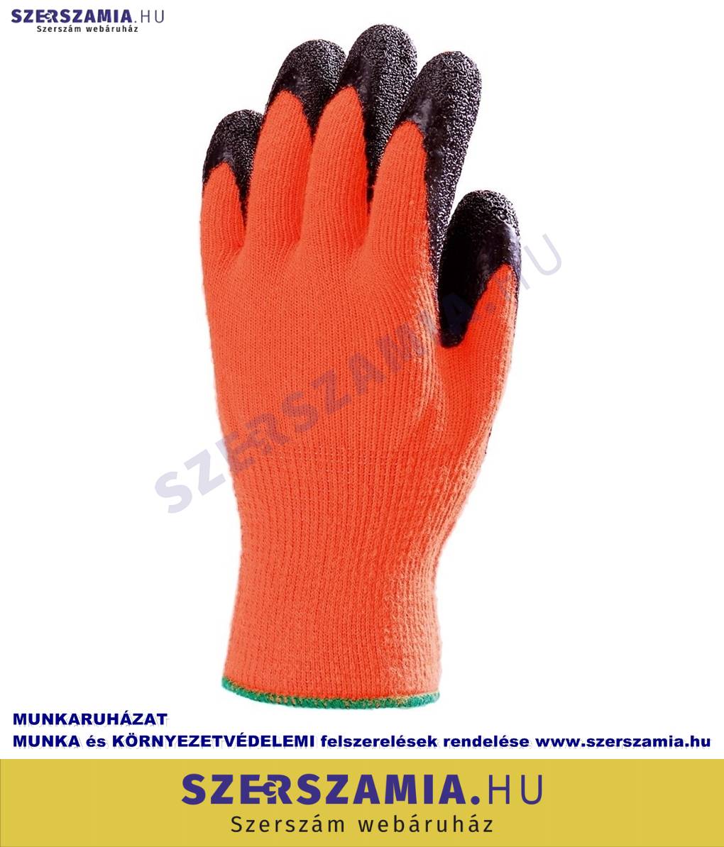 Kötött, fluo narancs színű, kopásálló poliészter alapkesztyű. Érdes, fekete szemcsés, erős latex tenyér. Téli hideg klíma hatása elleni bolyhos bélés, gumírozott mandzsettával. Csúszásbiztos, szúrás ellen is jól védő kesztyű. Méret: 8, 9, 10 és 11-es. Csomagolás: 120/10 EU SZABVÁNY: EN420, EN388: 2242, EN511: X20