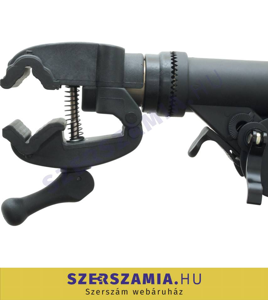 Gyorsan felállítható, összecsukható állvány, teleszkópos magasság állítási lehetőséggel és műanyag fogó pofákkal a bicikliváz vagy ülés biztonságos megfogása érdekében.